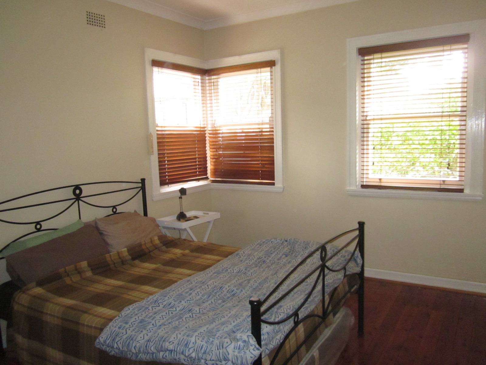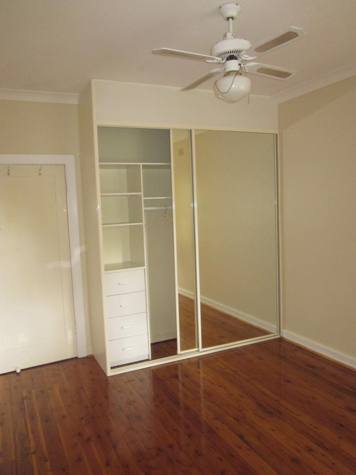 The master bedroom has large built-in wardrobes, a queen size bed and a ceiling fan.