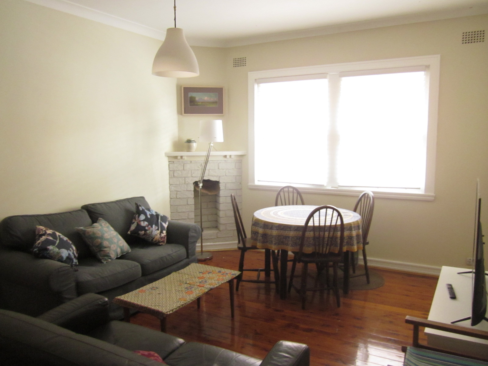 The apartment has a large loungeroom, with polished floorboards, featuring..